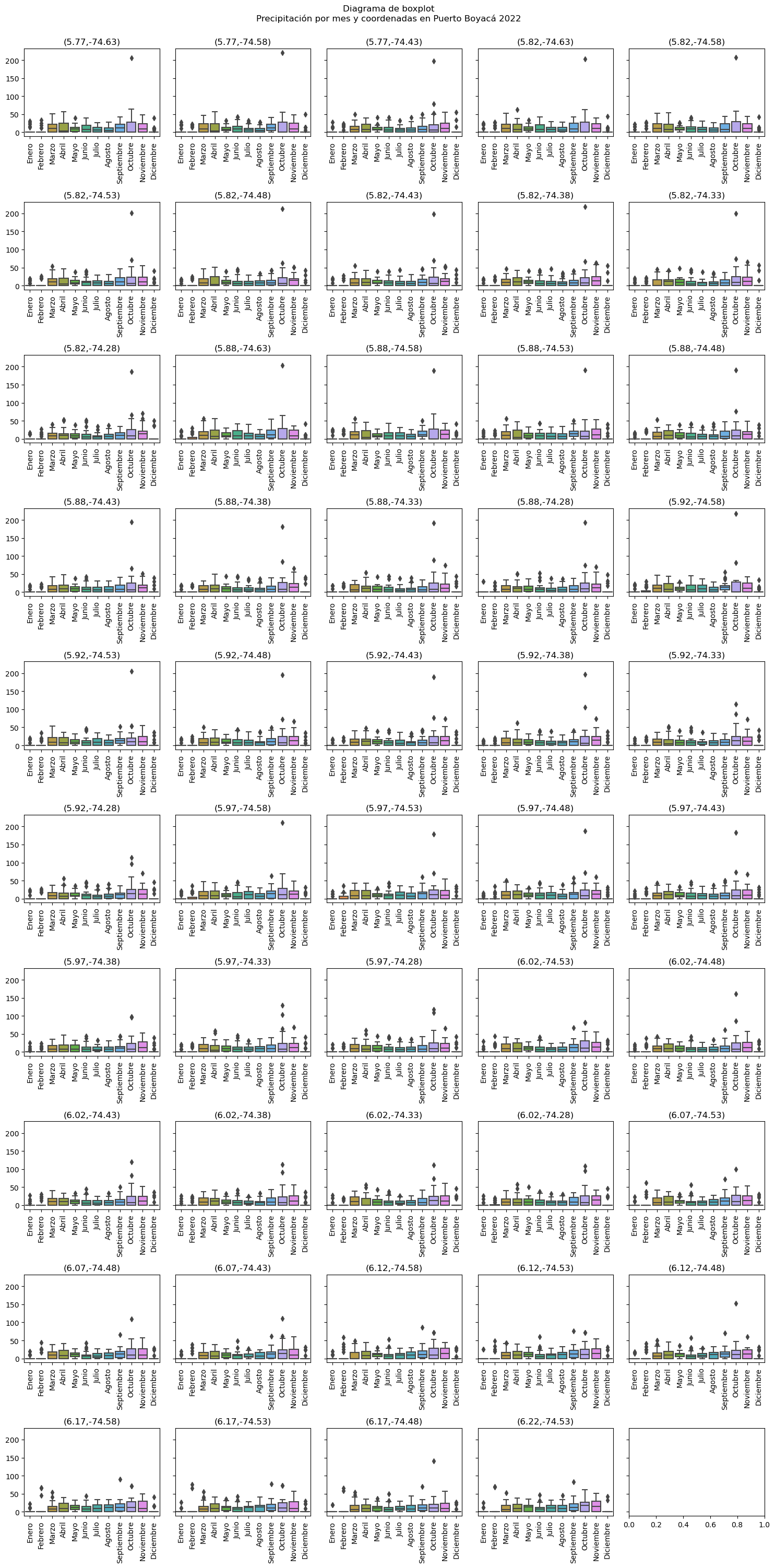 Para detectar los valores atípicos, se utilizaron diagramas de boxplot aplicados a cada mes y a cada uno de los puntos de medición de precipitación. Estos diagramas identifican valores atípicos utilizando los cuartiles y el rango intercuartil (IQR) de la siguiente manera:
