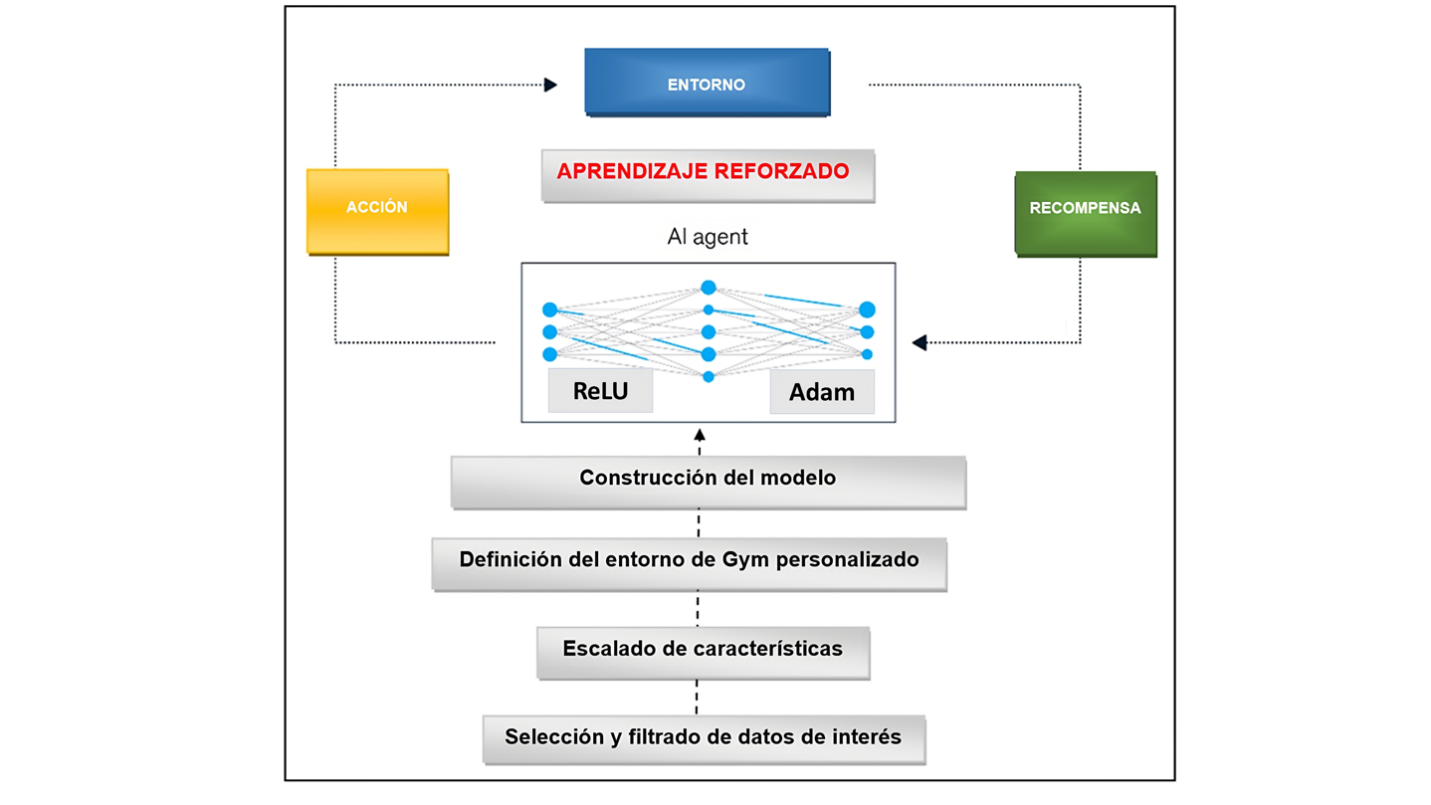 A continuación, se detalla mejor tal proceso. Para alcanzar este objetivo, se emplea el aprendizaje reforzado con técnicas de optimización para descubrir la política óptima del agente, que relaciona los estados del entorno con sus acciones. El algoritmo de aprendizaje reforzado profundo utiliza una red neuronal profunda para aproximar la función Q, lo que le permite lidiar con entornos complejos y conjuntos de datos extensos. El agente selecciona la acción que se espera que tenga la recompensa más alta según las expectativas de recompensa futura calculadas por la red neuronal. El ciclo se repite para encontrar la política óptima que maximice las recompensas acumuladas a largo plazo, utilizando un algoritmo llamado Deep Q-Network (DQN) que se basa en técnicas avanzadas de aprendizaje profundo para estimar y actualizar en tiempo real la función Q. En la Figura 7 se presenta la arquitectura del modelo de simulación Montecarlo aplicado.
