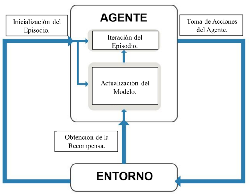 El entrenamiento del agente comprende 50 episodios, donde cada episodio representa una interacción entre el agente y el entorno (Figura 8). El proceso de entrenamiento consta de varias etapas.