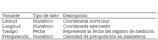 Cada uno de los atributos identificados tiene una función única en la construcción y validación de los modelos predictivos. Su selección y caracterización permiten comprender las relaciones complejas entre diferentes factores espacio temporales y cómo influyen en los patrones de precipitación. Estos atributos se consideran en conjunto en la creación de los modelos que puedan capturar la variabilidad y las tendencias en los datos de precipitación, lo que finalmente conduce a predicciones más precisas y fundamentadas.