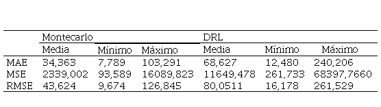 El MSE se utilizó para cuantificar la magnitud promedio de los errores cuadráticos entre las predicciones y los valores reales. Para el modelo Montecarlo, el MSE promedio fue de 2339,002, con un mínimo de 93,589 y un máximo de 16089,823; reflejando errores cuadráticos de magnitudes variables. En el modelo DRL, el MSE promedio fue de 11649,478, con un mínimo de 261,733 y un máximo de 68397,7660, mostrando una magnitud moderada de errores cuadráticos con alta variabilidad.