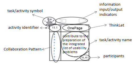 Each task's description is depicted using the HAMSTERS extension. The model is represented by a figure or graphic, where the task is symbolized by a rectangle composed of five fields: the task identifier in the upper left, the associated ThinkLets or Gamestorming in the upper right, the main collaboration pattern on the left, the task name in the largest field, and the acronym of participants or mandatory roles in the lower right triangle, formed by the first letters of each role's name (see Figure 1).