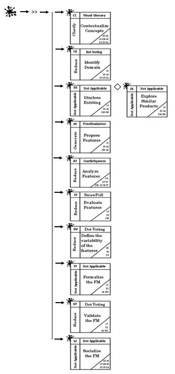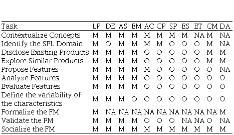 The feature model definition team comprises the following roles: Project Leader (PL), Domain Expert (DE), Software Architect (SA), Marketing Expert (ME), Collaborative Work Advisor (CA), Potential Customer (PC), Sales Person (SP), SPL Expert (SE), Technical Expert (TE), Domain Analyst (DA), and Company Product Manager (CP), each bringing necessary knowledge and experience. CINDERELLA specifies for each role whether their participation is mandatory or optional. Table 3 illustrates the roles' participation in each task proposed by CINDERELLA, indicating whether their involvement is mandatory, optional, or not applicable if a role does not participate in a particular task.