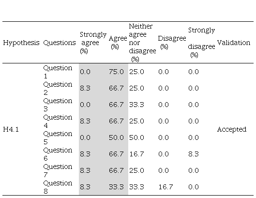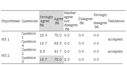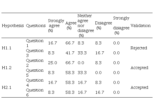 The hypotheses were validated using the results obtained from the survey conducted among the participants of the experiment. The detailed results are presented in Tables 9, 10, and 11.