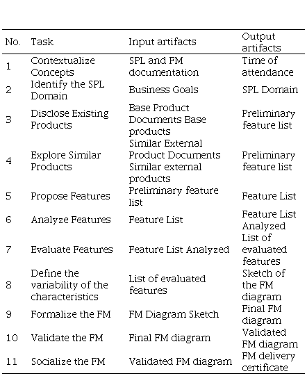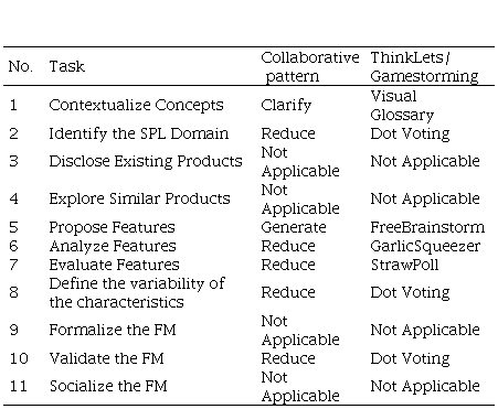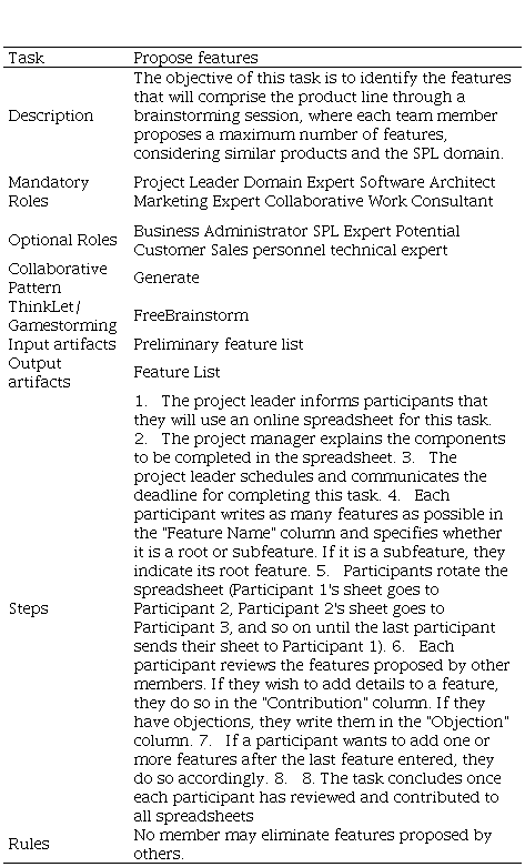 CINDERELLA consists of eleven tasks detailed to guide their execution and achieve the objectives set by the assigned roles. For each task, appropriate collaboration patterns have been identified based on the teamwork required and the objective of each group activity [32]. The tasks comprise steps or actions adapted using ThinkLets or Gamestorming to enhance collaboration among roles and guide task development. ThinkLets are reusable units for defining predictable and repeatable teamwork tasks [33], while Gamestorming proposes game-based techniques to foster interactive and creative activities among team members [34]. CINDERELLA was developed using the Collaborative Engineering approach to design [35]. Table 1 illustrates the relationships between tasks necessary for creating a feature model and the collaborative elements integrated into the proposed approach. Table 2 outlines the input and output artifacts for each task specified by the approach.