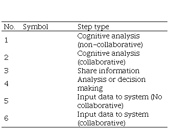 The description of each task specifies the steps required for completion. The HAMSTERS extension incorporates graphical elements to represent the type of step to be performed. This notation indicates whether the step involves collaboration and specifies the type of collaboration. Table 4 illustrates the graphical notation and types of steps.