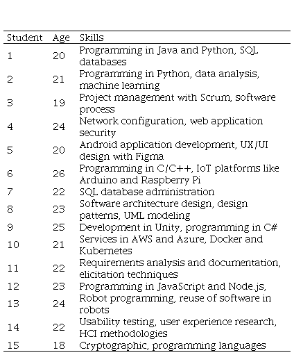 The Table 6 presents the profiles of the students who participated in the academic experiment. This group represents a spectrum of expertise in different fields of software engineering, providing an overview of the participants' capabilities.