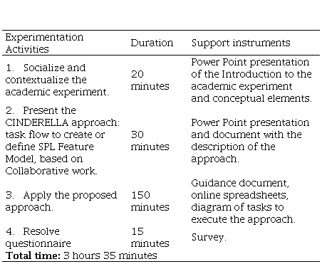 Table 7 summarizes the activities planned for the development of the experiment, along with the estimated time for their execution and the tools to support their development.