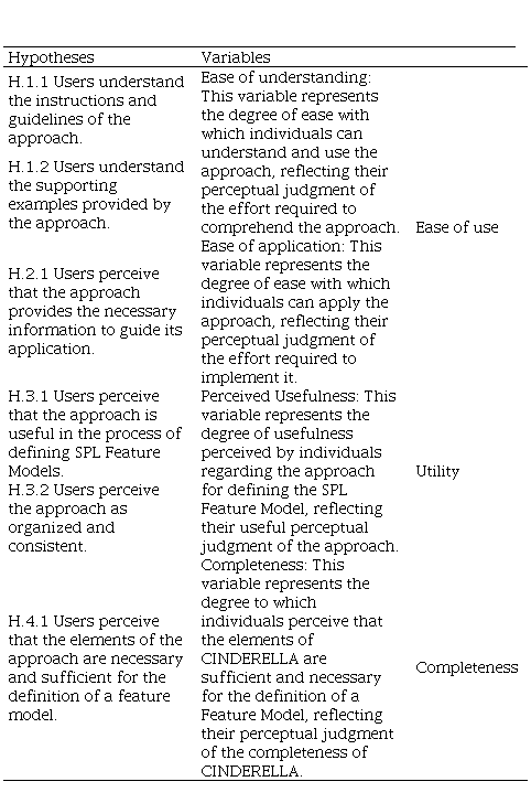 The experiment followed the planned activities closely, with only minor deviations in time allocation. This allowed the students to fully participate in each activity of the process. The final activity involved collecting information through surveys using the Likert scale, providing students' perceptions of CINDERELLA. Responses regarding ease of use showed mixed results. While the students easily understood the practical examples provided by CINDERELLA (H1.2 accepted), the instructions and guidelines were not entirely clear to all participants (H1.1 rejected). This suggests that, although the practical examples were effective, the instructional content could benefit from greater simplicity or clarity to improve comprehension. The students positively rated the usefulness of the approach. They accepted the hypotheses about its usefulness for defining Feature Models (H3.1) and its organization and coherence (H3.2). These results highlight the practical value and systematic nature of the approach from the participants' perspective. The students accepted the CINDERELLA completeness hypothesis (H4.1), with most questions receiving good scores. This indicates that they found the elements of CINDERELLA both necessary and sufficient, affirming the comprehensiveness of the approach.