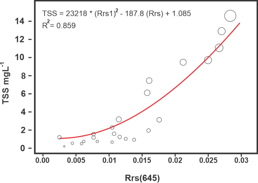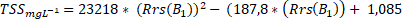 A large number of regional algorithms have been developed to estimate the TSS variable; these can be calculated from the correlation between the concentration of the variable measured in-situ and the reflectance contained in the image pixels and using the measure field reflectance collected (the models found among the relationships of the variables can be linear, quadratic, exponential, logarithmic or polynomial type) [49], [9].
