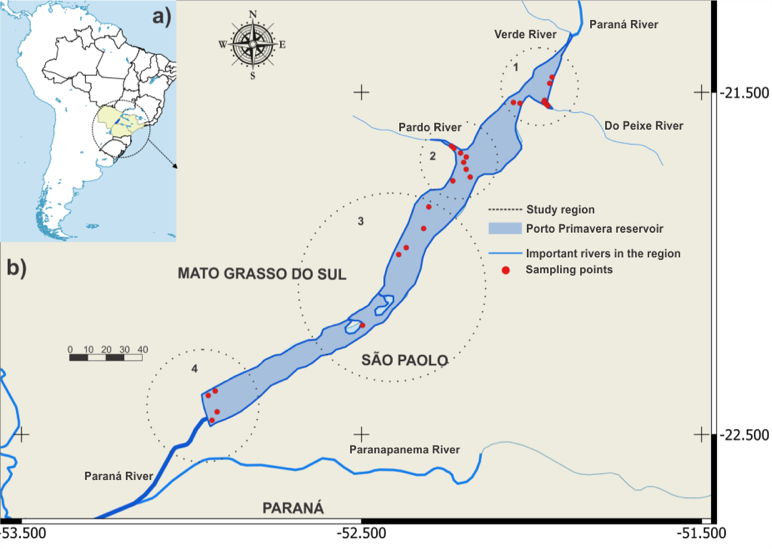 The Porto Primavera reservoir (53o W to 52o W and 22o to 22'S -30'S), as shown in Figure 1a, is located in the south-west of Brazil [32]. The maximum depth of the lake is 35 m and occupies an area of 2500 km. [31]. The wall built to form the reservoir, is the largest in the country, with a length of 10186.20 m. The main function of this reservoir is the generation of electricity, with a capacity of 1814 MW, which corresponds to 23 % of the energy consumed by the State of Sao Paulo [36], [37].