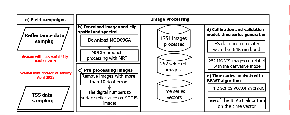 Five main processes were conducted in order to extracts the historical concentration of TSS variable over a period of 20 years using MODIS images (MOD09GA) in PPR (Figure 2). The process (a) shows field campaigns radiometric and TSS data collection in PPR, next step (b) was download the MODIS images and clip spatial and spectrally MOD09GA products. Quality Control bands (state_1 km and QC_500 m) that come with the MOD09GA reflectance products are used to ensure the quality of the images, the resulting image is converted to surface reflectance (box c). The TSS values obtained in the laboratory are correlated, analytically, with the field spectral data corresponding to the band centered at 645 nm, the model is extrapolated to a time series of 252 MODIS images (box d). Finally, time series vectors are extracted from pixels that match the sampling points, an average vector is obtained from the 25 sampling observations, and lastly the average time series is separated and analyzed using the BFAST algorithm (box e).