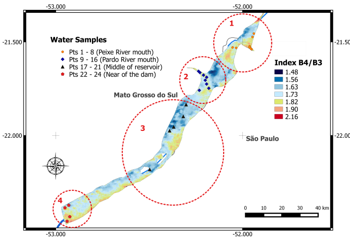 The spectral curves obtained at some sampling stations maintained similar characteristics in two fieldworks. The points collected at the mouth of the Peixe River (2A), transition zone (2C) and in the regions near the barrier, showed that the spectral curves are similar to those published by [17], [60]-[64] especially with bodies of water with a dominant presence of Chl-a. However, the estimated concentrations of Chl-a in the Porto Primavera reservoir are lower than those found by the aforementioned authors.