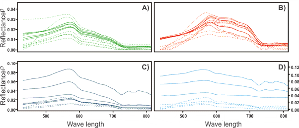 Once the spectral curves generated by the field spectroradiometer were obtained, a classification is carried out to discriminate the areas where the hyperspectral samples were collected and the dates on which the fieldwork was performed (Figure 2). It is observed in the graphs that all spectral curves show a characteristic behavior of water, there is a low reflectance in the spectral range from 400 nm to 500 nm associated with strong absorption by organic matter.
