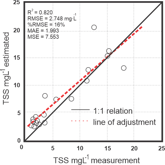 The fieldwork carried out in April 2015 was used to validate the model (Figure 4). The data collected in this sampling campaign confirm that the performance of the algorithm remains satisfactory to retrieve the values of the TSS variable (R2 = 0.82; RMSE 2.74). The results coming from the statistical estimators indicate that the model used (Figure 5) shows an adequate degree of accuracy and consistency in predictive results (Figure 6).
