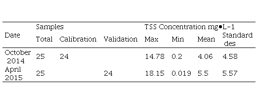 Fieldwork was applied on dates when the TSS parameter had less (October 6th ~ 10th (2014) and greater variability (April 13th ~ 16th (2015)). The data include a total of 49 samples, 24 samples from October (2014) and 25 samples from April (2015). Table 1 shows the exploratory analysis data and descriptive statistics of TSS in field campaigns. The collection of spectroradiometry samples were carried out between 9 am and 3 pm local time. In order to measure and analyze the TSS variable, it was necessary to collect water samples in bottles and filter their contents using a vacuum pump and Whatman filters of 0.5 µm–0.7 µm. These filters were previously incinerated at 480 .C for six hours in a muffle and weighed on an analytical balance before being released to fieldwork. Once in situ sampling was completed, the filters were stored at -4.C in a refrigerator and then dried for 24 hours at 60.C on a stove. At the end, the filters were weighed again and (1) was used to determine the total amount of matter suspended in water [39].