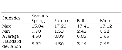 To complement the findings of Figure 8, Table 2 shows a descriptive statistical analysis of the seasonality found in the TSS concentration time series, it was detected that the maximum value within the entire time series was presented in the month of May (autumn) 2011, the lowest value was presented in October 2009, the highest average values occurs in the summer season, a season that coincides with the highest amount of rainfall in southern latitudes. In the same way, it is found from the data in this table that the average increase in TSS in the winter-spring seasons is 0.94 mgL-1 and in the change of spring-summer season it is on average 3.49 mgL-1, this increase is due to the greater occurrence of rains, which generate a large amount of particulate material that ends up in the reservoir.