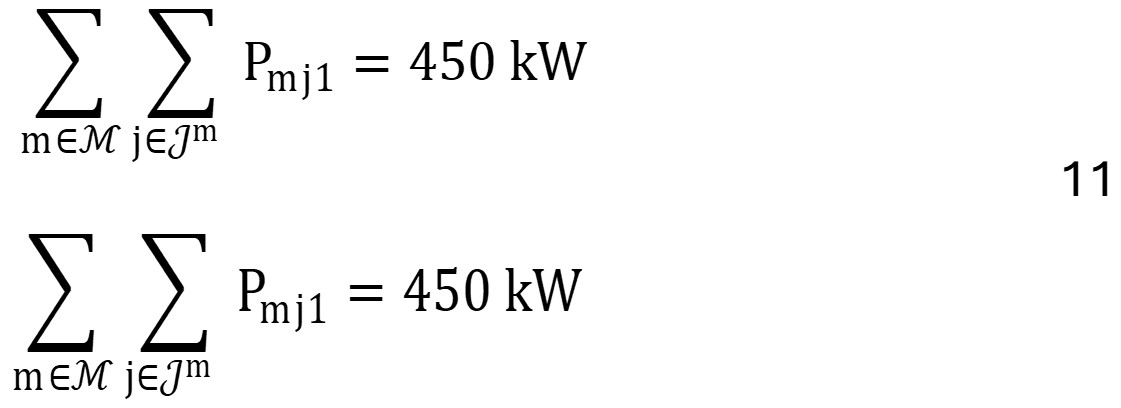 Cada generador de energía puede suplir la demanda de su microrred o vender potencia a la microrred vecina. Para el caso de estudio puntual, se tiene que la microrred 1 requiere la mitad de demanda que la 2, entonces 𝑛1 =450 𝑘𝑊 y 𝑛2=900 𝑘𝑊, quedando la restricción (4) desplegada en (11):