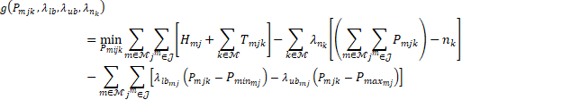 La función de Lagrange se construye definiendo los multiplicadores 𝜆𝑙𝑏 = ⋃𝒎 ∈ 𝓜{𝜆𝑙𝑏𝑚1,…𝜆𝑙𝑏𝑚𝐽𝑚}, 𝜆𝑢𝑏 = ⋃ 𝒎 ∈ 𝓜 {𝜆𝑙𝑏𝑚1,…𝜆𝑙𝑏𝑚𝐽𝑚}, 𝜆𝑛𝑘,∀𝑘, asociados con las restricciones (3) y (4). Estos multiplicadores corresponden a los límites superior (𝜆𝑙𝑏) e inferior (𝜆𝑢𝑏) de operación y de demanda (𝜆𝑛𝑘) de la microrred. El problema primal queda relajado, como se expone en (5):