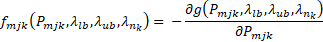 (10)Además, se garantiza la minimización de la función potencial g (P_ijk,λ_lb,λ_ub,λ_(n_k )) al igualarse las funciones de aptitud (costos marginales) en el punto de equilibrio. En este caso, las soluciones del replicador dinámico se usan en el proceso de maximización planteado en (6) realizado con el gradiente ascendente.