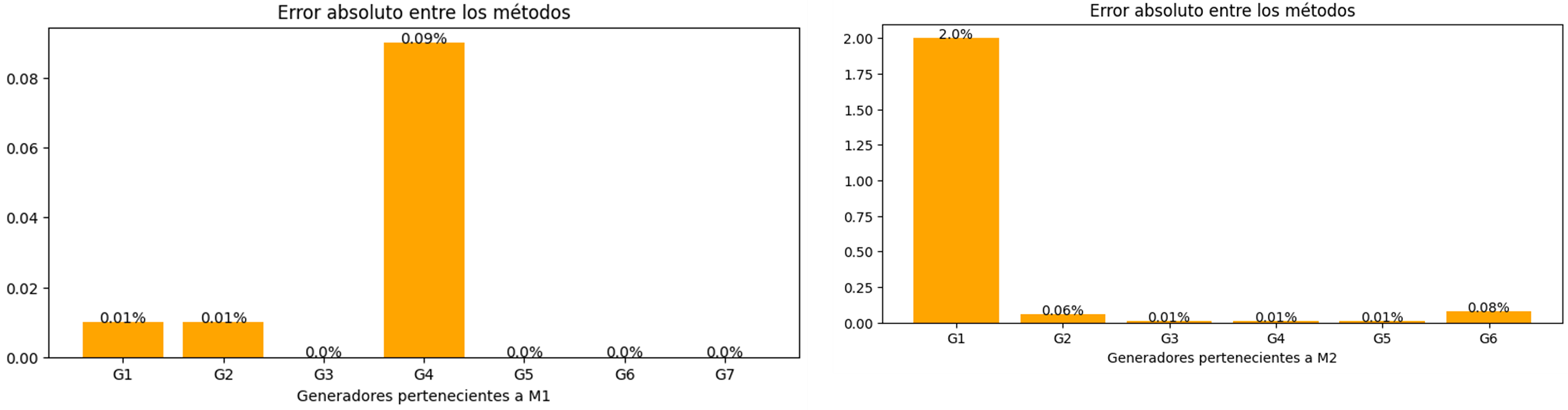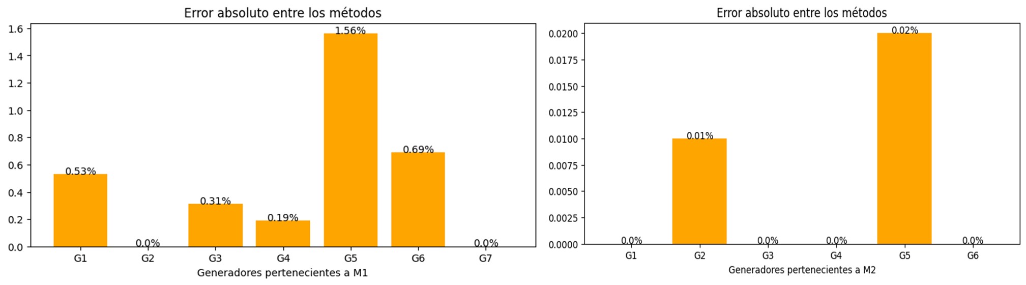 Se puede observar que los resultados obtenidos con el método basado en dinámica poblacionales y en punto interior difieren. Sin embargo, la función de costo evaluada llega a un mínimo con una diferencia de $1,19 y un error de 1,84×10-6 como valor teórico el dado por método tradicional. Las restricciones de demanda en cada microrred se suplen en los dos métodos de solución. Por lo tanto, se considera que existen diferentes combinaciones de potencias que conllevan al mínimo. Además, se puede determinar que al realizar la suma de las potencias 𝑃𝑚𝑗1+𝑃𝑚2, correspondiente al despacho total de cada generador, las dos soluciones convergen a los mismos valores con un error absoluto considerablemente bajo (ver Figura 5). Así, se puede concluir que el método implementado logra optimizar la función de costo y determina de manera adecuada las cantidades de energía.