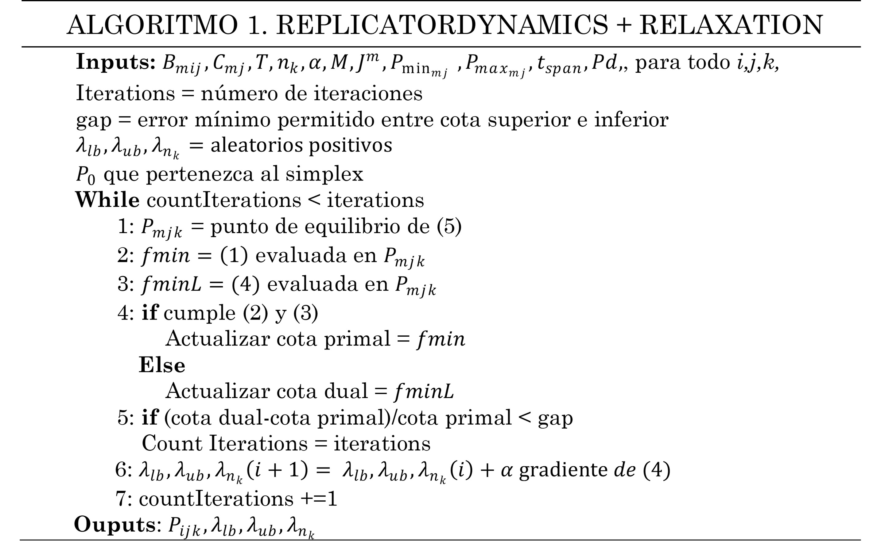En el siguiente pseudocódigo se presenta el algoritmo que describe la relación entre el planteamiento de la sección 2.2.1 (Relajación lagrangiana) y 2.2.2 (Dinámica de replicadores). Se inicia con la definición de los parámetros de entrada. Luego, por medio de un proceso iterativo y de retroalimentación entre los puntos de equilibrios obtenidos de (7) y los multiplicadores de Lagrange obtenidos por medio de gradiente ascendente, se obtiene 𝑓⋆. El proceso se repite hasta alcanzar un gap de optimalidad, determinado por el error entre el valor de la cota dual y la primal. La cota dual es igual al valor de la función de costos original siempre que cumpla con las restricciones (3) y (4). La tasa de aprendizaje 𝛼 decrece con cada iteración. Para los casos de estudio implementados, se inicia con alpha=0,7 y se reduce 1 % por iteración para el cálculo de 𝜆𝑙𝑏,𝜆𝑢𝑏, y 3 % para 𝜆𝑛𝑘.