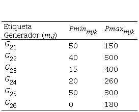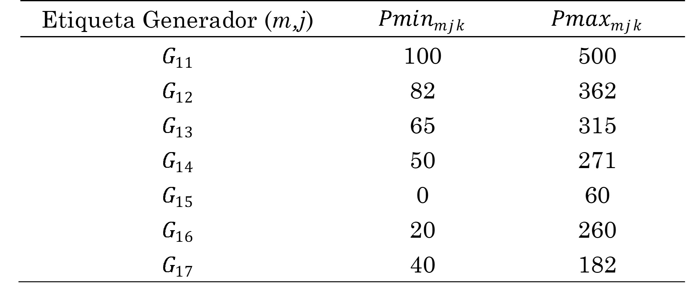 Los costos de generación y los límites de operación para cada uno de los generadores fueron extraídos de [25], [27]. Dichos límites son cruciales para garantizar que los generadores operen dentro de los límites de capacidad de las líneas de distribución para evitar sobrecargas y posibles problemas de estabilidad en el sistema eléctrico.