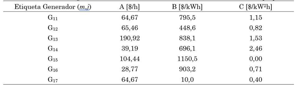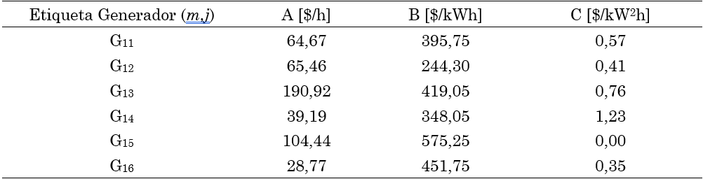 El costo de generación contempla el valor de los recursos que han sido necesarios para producir la potencia demandada. Por ejemplo, el costo del combustible empleado en generadores diésel. Para modelar dicho costo, es conveniente asociar a cada generador una función que depende, tanto de la tecnología utilizada, como de la potencia producida. 𝑗-ésimo generador de la 𝑚-ésima microrred, dicha función, denotada como 𝐻𝑚𝑗, está dada por 𝐻𝑚𝑗=𝐴𝑚𝑗+𝐵𝑚𝑗𝑃𝑚𝑗+𝐶𝑚𝑗𝑃2𝑚𝑗, donde 𝑃𝑚𝑗 es la potencia despachada por la unidad, y 𝐴𝑚𝑗, 𝐵𝑚𝑗 y 𝐶𝑗 son parámetros positivos que modelan características intrínsecas del generador, tales como su tipo o eficiencia.
