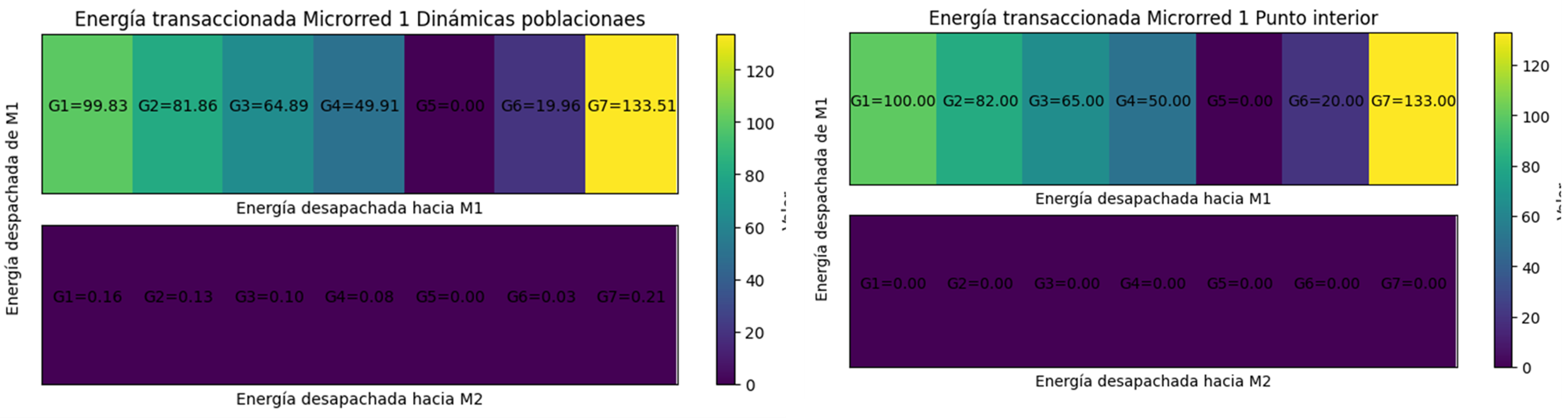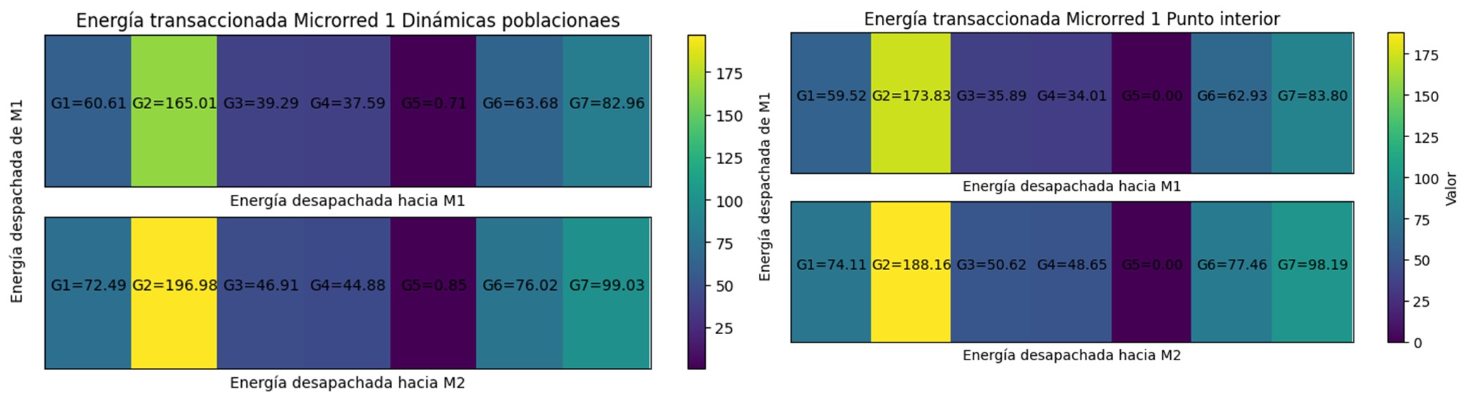 Para los casos de estudio se presentan los diagramas de calor en las Figuras 3 - 9. Allí, se puede observar el despacho realizado por cada uno de los generadores, la microrred a la que pertenecen (eje vertical) y la microrred que recibe la energía (eje horizontal).