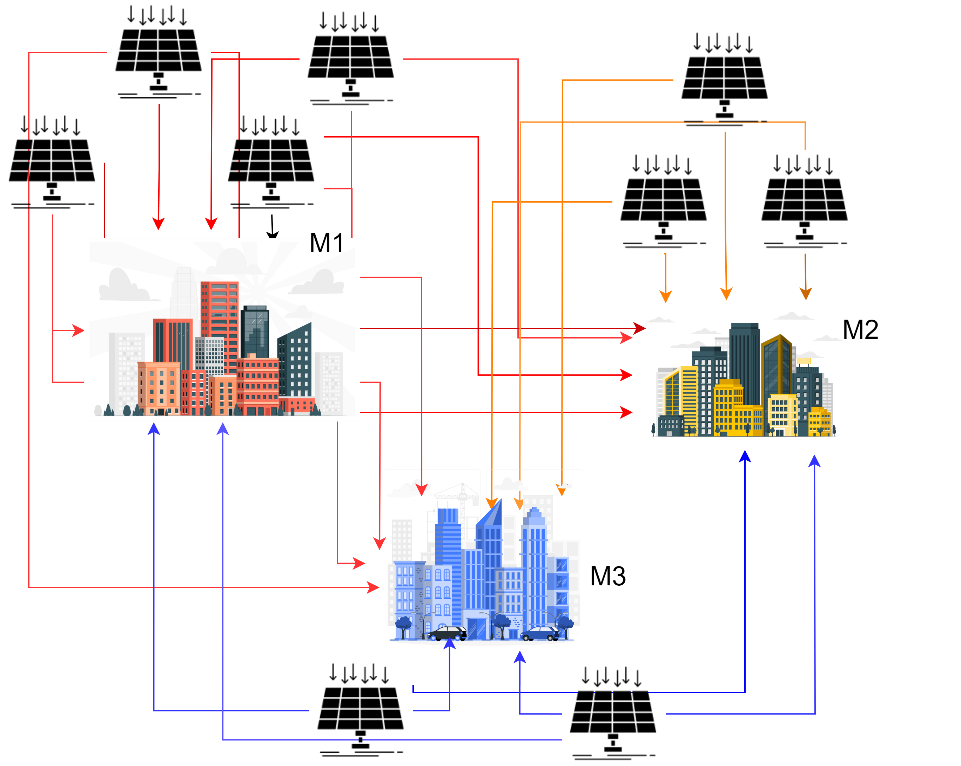 El modelo de transacción de energía involucra un conjunto de microrredes ℳ = {1,2, … , 𝑀}, donde en la 𝑚-ésima microrred se ha instalado un conjunto de generadores 𝒥𝑚 = {1,2, … , 𝐽𝑚 }. Se asume que cada microrred puede consumir la energía producida por sus generadores, así como inyectarla al resto de microrredes de ℳ. El objetivo de abordar este problema es suplir la demanda total del sistema, mientras se disminuyen los costos asociados a la generación y transmisión de energía.