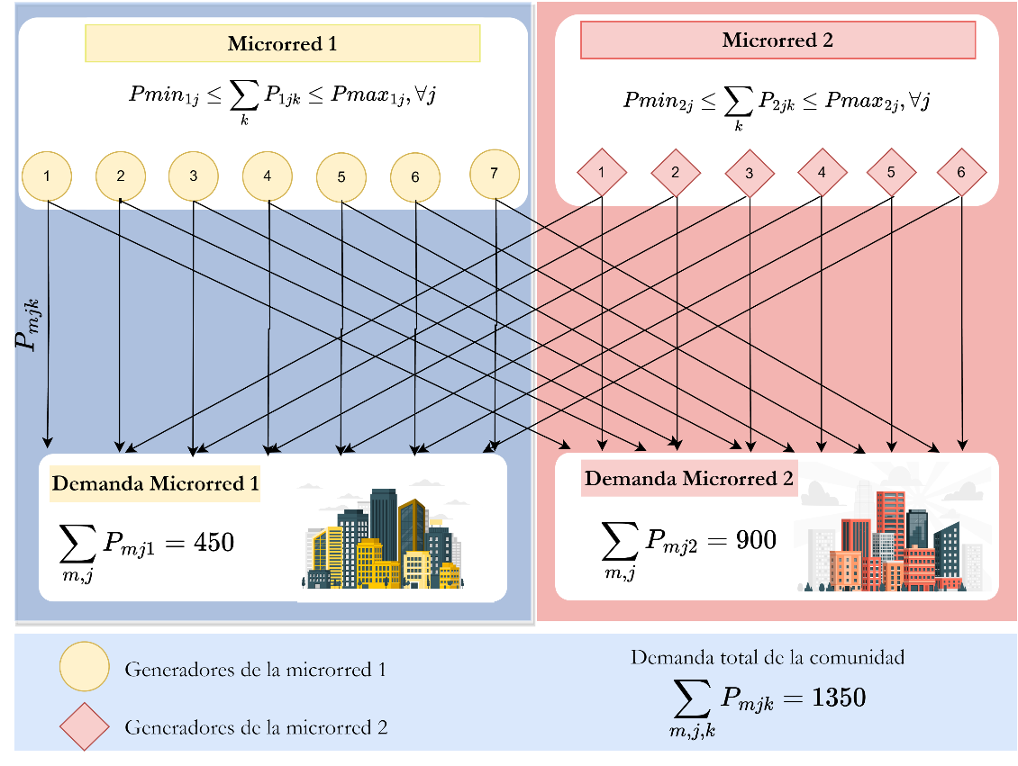La investigación presente contrasta con los modelos previamente propuestos en [13], [14], y [15], los cuales abordan el concepto de multimicrorredes y consideran una variedad de factores, como la respuesta de la demanda eléctrica y térmica, la interacción multienergética y las incertidumbres asociadas. En adición, las metodologías de solución son distintas, ya que, según lo propuesto en este trabajo, se obtiene mediante un algoritmo iterativo. En contraste, el modelo [13] es solucionado mediante programación estocástica, utilizando el riesgo condicional como base, y [15] se enfoca en optimizar los beneficios de los prosumidores energéticos agrupados en microrredes virtuales (VMG) mediante un modelo de juego de Stackelberg. En dichos modelos no es clara la penalización de la transmisión entre microrredes, además, no se llegan a considerar los costos de operación que asume cada unidad generadora perteneciente a la comunidad.