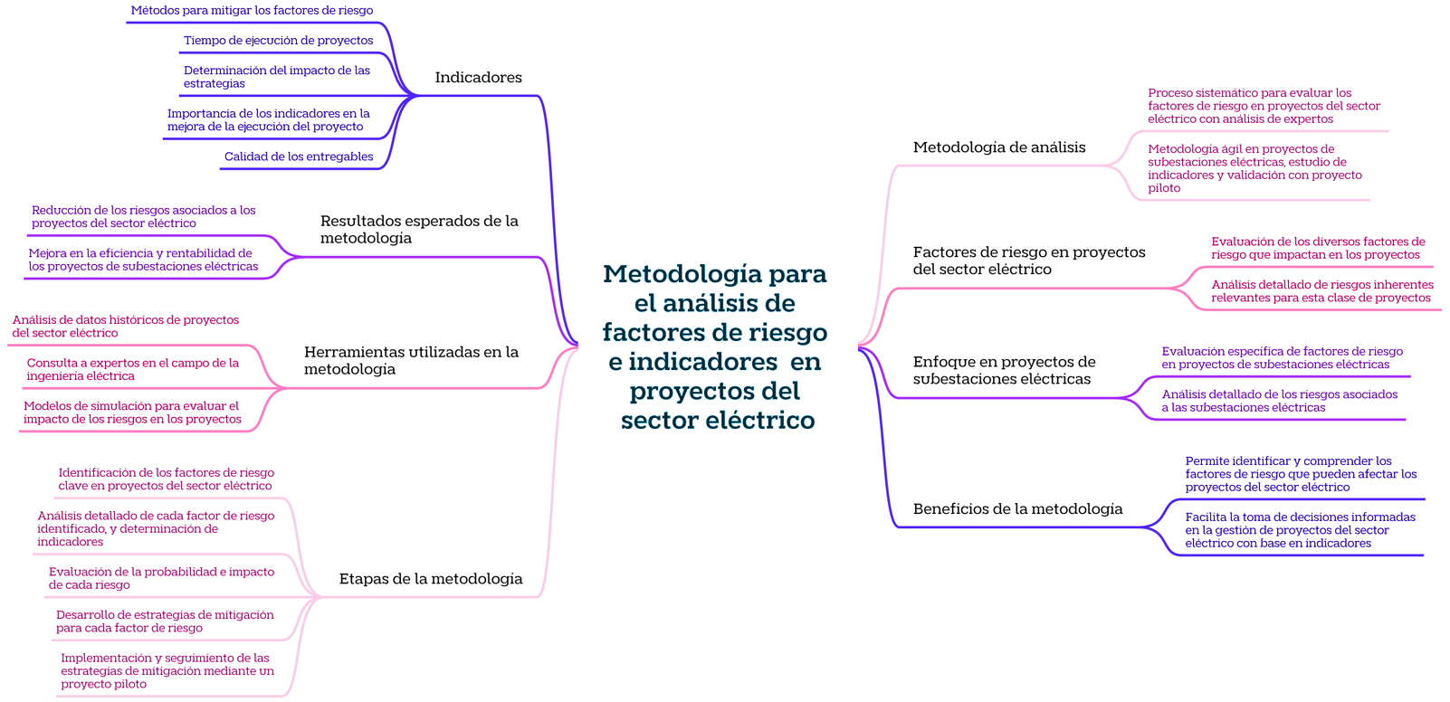 En esta sección, se presenta la metodología diseñada para analizar cada uno de los diversos factores de riesgo que impactan en los proyectos del sector eléctrico, con un enfoque particular en los proyectos de subestaciones eléctricas. Además, se identifican los indicadores que facilitan un control y seguimiento efectivo de estos riesgos. Este artículo surge en respuesta a la dinámica cambiante de una industria en constante evolución, donde la optimización de la productividad en términos de tiempo y recursos es fundamental. En este contexto, la implementación de metodologías ágiles se perfila como una estrategia prometedora, en donde destaca la creciente popularidad de la metodología Scrum, una metodología ágil ampliamente adoptada en diversas empresas que buscan expandir mejorar su rentabilidad mediante el desarrollo ágil de sus proyectos [17], [18].