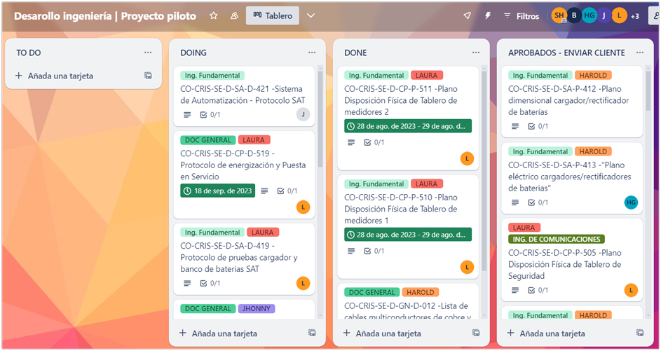 Con esta idea en mente se presenta la aplicación Trello. Esta herramienta facilita la organización y claridad en el flujo de trabajo durante la etapa de diseño del proyecto [30]. Además, ofrece al gestor del proyecto la capacidad de supervisar las actividades de cada miembro del equipo de forma transparente y organizada, sin la necesidad de convocar reuniones constantes. Al mismo tiempo, permite mantener al equipo informado sobre las tareas asignadas en ese momento y después de completar cada actividad, lo que proporciona una mayor flexibilidad al proyecto. Dentro del marco de trabajo de Trello, se organizó toda la documentación necesaria para la etapa de diseño y se estableció una secuencia de actividades siguiendo la metodología Kanban, que comprende las fases "to do", "doing" y "done", un flujo de trabajo estándar en cualquier proyecto. Además, se agregaron dos secciones adicionales, una para los documentos pendientes de revisión por parte del líder técnico y otra para la información lista para enviar al cliente como se puede ver en la Figura 3. El objetivo era que esta herramienta no solo mejorara la fluidez del trabajo, sino que también redujera el tiempo dedicado a las reuniones de seguimiento “progress meetings”.