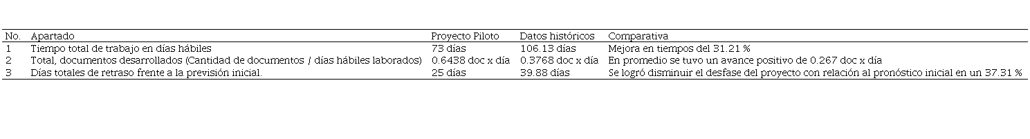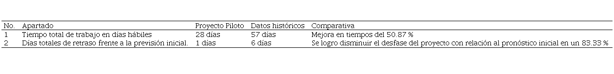 Estos desafíos destacan la importancia de la experiencia y la capacitación del equipo en proyectos de esta índole. Además, subrayan la utilidad y la necesidad de herramientas efectivas de gestión y seguimiento, como el Dashboard y las reuniones presenciales, para identificar y abordar rápidamente los problemas que surgen durante el ensamble de los tableros. Los resultados de la etapa final evaluada en este artículo se presentan en comparación a datos históricos de proyectos con alcance similar para contrastar los resultados obtenidos, como se puede observar en la Tabla 10.