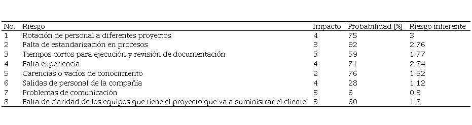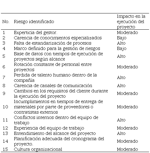 Todos los factores de riesgo identificados mediante la evaluación por juicio de expertos se presentan en la Tabla 2. Los riesgos identificados serán evaluados según su impacto en la ejecución del proyecto, utilizando la opinión de expertos como criterio principal. Esta evaluación se llevará a cabo mediante una escala que categoriza el impacto en tres niveles: alto, moderado y bajo. Un impacto alto indica que el riesgo afecta significativamente la ejecución del proyecto. En cambio, un impacto moderado señala que el riesgo afecta la ejecución, pero podría ser mitigado con la ayuda de herramientas o estrategias adicionales. Por último, un impacto bajo indica que la influencia del riesgo en el proyecto en cuestión es mínima o no relevante [3], [13].