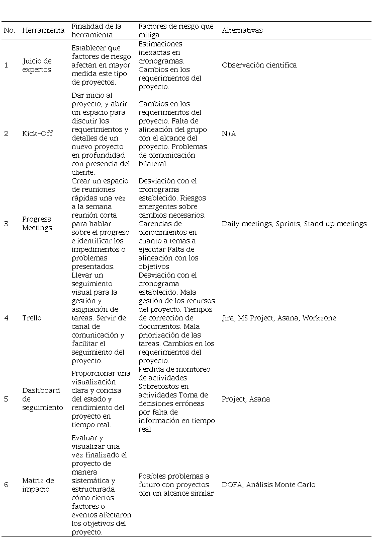 Una vez obtenidos los resultados de la implementación de la herramienta de juicio de expertos, se torna imprescindible llevar a cabo un análisis de los riesgos identificados. Con estos riesgos identificados, se buscarán alternativas viables destinadas a mitigar estos dentro del proyecto. Para este propósito, se recurrirá a diversas herramientas, las cuales serán seleccionadas en función de la relevancia de cada riesgo y de la necesidad de implementar medidas preventivas. Este enfoque garantizará la correcta gestión de riesgos, minimizando la probabilidad de contratiempos que puedan ocasionar retrasos durante la ejecución del proyecto.