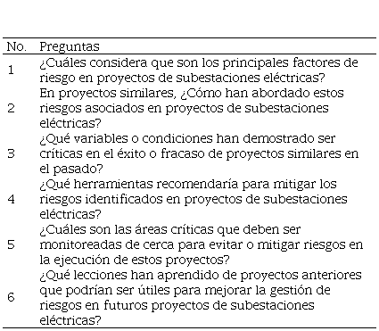 Según el Project Management Institute (PMI), el juicio de expertos es una de las herramientas más comunes en la planificación de la gestión de proyectos [22]. Esta herramienta dentro del proyecto tendrá como objetivo facilitar la identificación de deficiencias o debilidades que puedan haberse manifestado a lo largo del tiempo, tanto dentro de la compañía como en otras organizaciones en la ejecución de este tipo de proyectos, proporcionando así una perspectiva diferente y enriquecedora para abordar el desafío de mejorar la ejecución de estos. Con este propósito en mente, se procede a formular una serie de preguntas, como se observa en la Tabla 1, que tienen como fin obtener una comprensión más profunda de los factores de riesgo más comunes identificados por estos expertos a lo largo de sus carreras en proyectos relacionados con el diseño y puesta en marcha de subestaciones eléctricas en Colombia.