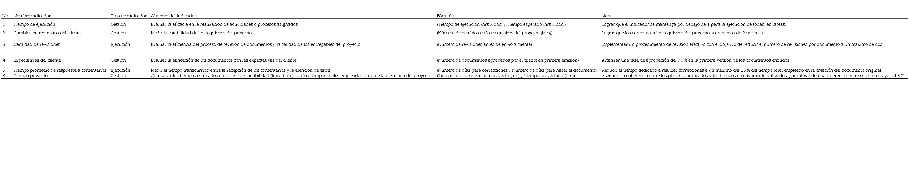 Considerando estos antecedentes, resulta fundamental establecer una serie de indicadores que aborden aspectos clave que permitan medir y evaluar el progreso del proyecto. Estos indicadores deben enfocarse en diversos aspectos, como los tiempos de ejecución del proyecto, la calidad de los entregables de ingeniería, el número de revisiones antes de la versión final, el grado de satisfacción del cliente, entre otros aspectos relevantes [15]. El objetivo, es que estos indicadores no solo permitan identificar áreas de mejora, sino que también guíen la toma de decisiones para alcanzar los objetivos establecidos.