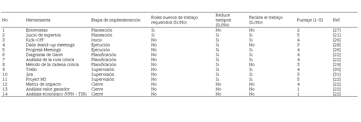 Con base en la información acá planteada, resulta esencial evaluar el impacto de cada herramienta en el proyecto, con el objetivo de seleccionar las más adecuadas para su desarrollo. Por tanto, es crucial que cada herramienta seleccionada cumpla con aspectos fundamentales, tales como facilitar la comunicación entre los participantes del proyecto, agilizar el trabajo, reducir el tiempo de las actividades, permitir el control del proyecto en tiempo real y mostrar resultados de manera clara y efectiva [13], [26]. Con base en estos criterios, se evaluarán las herramientas para determinar cuáles herramientas son útiles para este tipo de proyectos. Con esta consideración, con ayuda de expertos en el tema y de un análisis de revisión bibliográfica, se procedió a evaluar las diversas herramientas utilizando una escala de calificación del 1 al 5, donde 5 representa una herramienta ideal para satisfacer las necesidades del proyecto, mientras que 1 indica que la herramienta no sería muy útil, considerando que el enfoque se centra exclusivamente en mejorar las etapas de diseño y ensamble [21]. Además, dentro del análisis de la herramienta se realizaron una serie de preguntas buscando determinar los recursos necesarios para implementar cada una de estas, esto tiene como finalidad poder establecer la inversión requerida y así poder hacer un análisis costo-beneficio con y sin la herramienta para determinar su viabilidad, como se observa en la Tabla 5.
