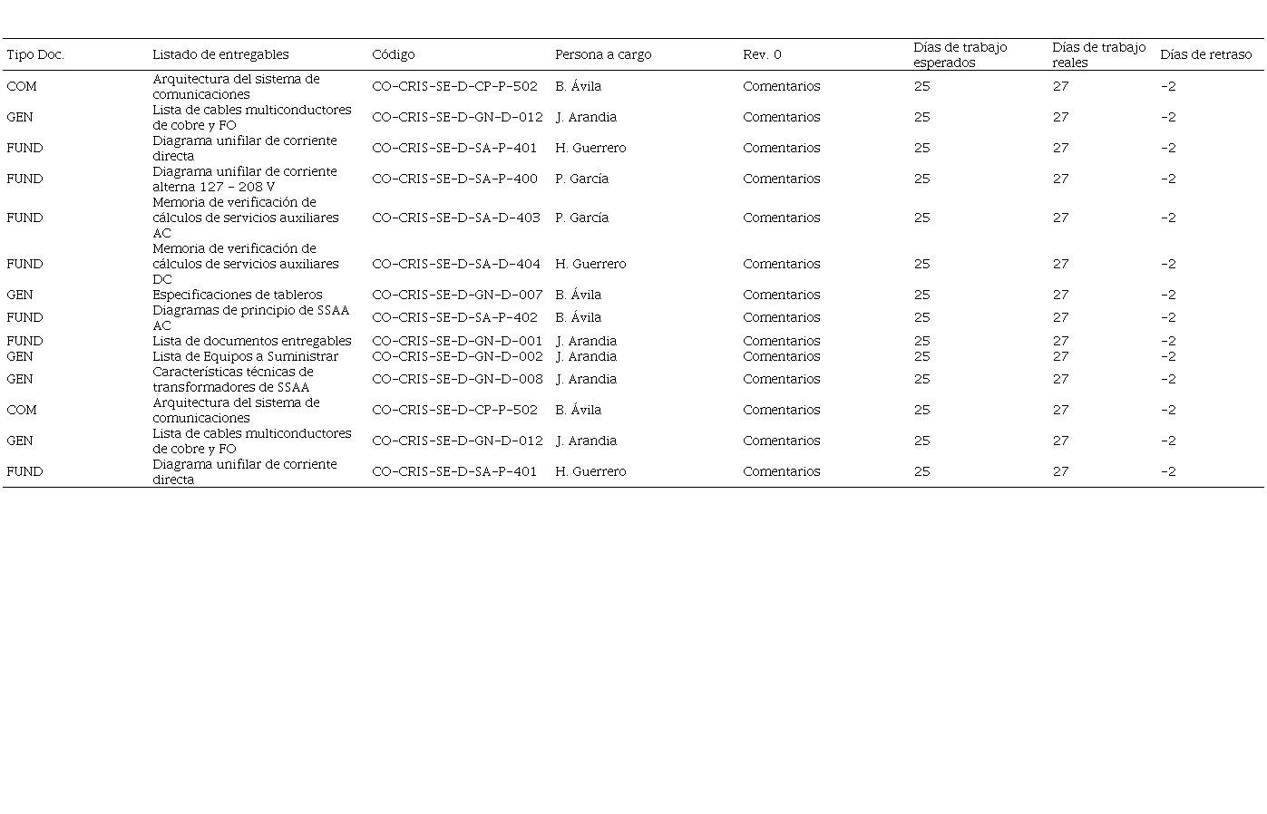 Por esta razón, se decidió implementar la creación de un Dashboard utilizando Excel. Este tenía como objetivo principal controlar los tiempos de entrega reales de cada documento, en comparación con los plazos establecidos en la plataforma Trello. De esta manera, se aseguraría la obtención de datos precisos para realizar comparaciones al final del proyecto y se mantendría un registro histórico de la evolución de cada documento y del conjunto de los mismos. Además, el Dashboard contribuiría al control del número de versiones emitidas para cada documento, lo que proporcionaría una visión más completa del proceso de desarrollo de la ingeniería, como se observa en Tabla 8.