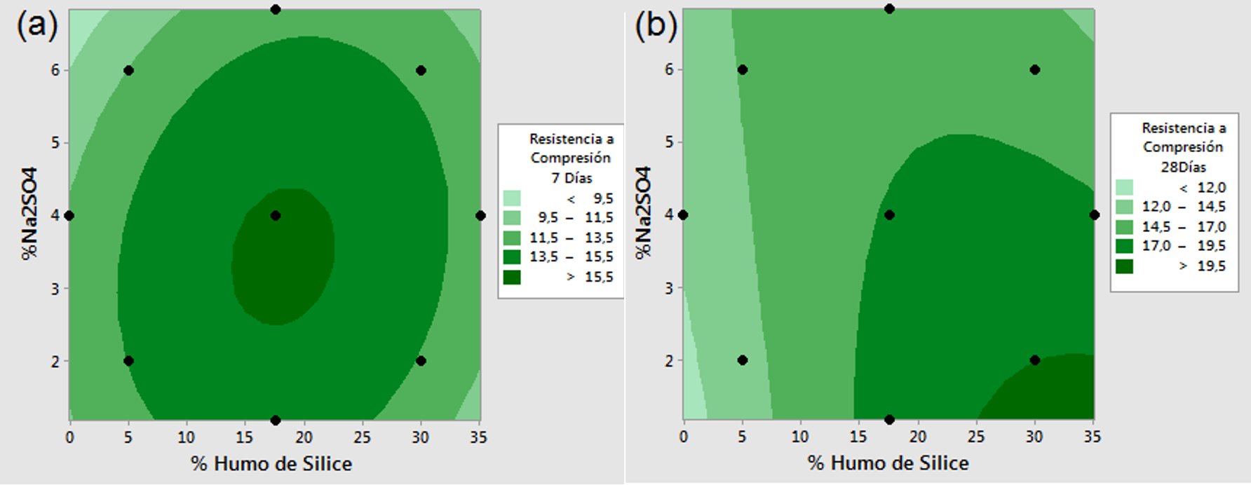 En la Figura 1 se muestran los gráficos de contorno obtenidos a partir de los resultados de resistencia de las mezclas incluidas en la Tabla 3. En esta figura se puede apreciar el efecto en la resistencia mecánica a compresión (RC) del porcentaje en peso del Na.SO4 (NS) en relación con la incorporación de HS. A los 7 días de curado (Figura 1a), las resistencias más altas se obtienen con NS entre 2,5 y 4,2 % y con una incorporación de HS entre 15 % y 20 %, alcanzando valores de resistencia de 15 MPa. En la Figura 1b, se observa la evolución de la resistencia a los 28 días, en este caso, se observa que las resistencias más altas (máximo 19 MPa), se obtienen con porcentajes de NS entre 0 y 2 %, con una incorporación de HS entre 25 % y 35 % en peso como reemplazo de CV. Se evidencia que la presencia de HS promueve la ganancia de RC, lo que puede estar relacionado con el aporte de sílice amorfa de HS que al reaccionar con el hidróxido de calcio producido por la hidratación del cemento da lugar a la formación de silicato de calcio hidratado (CSH) [32]-[34]. Adicionalmente el tamaño de las partículas de HS contribuye a una mayor densificación de la pasta [35], [36].