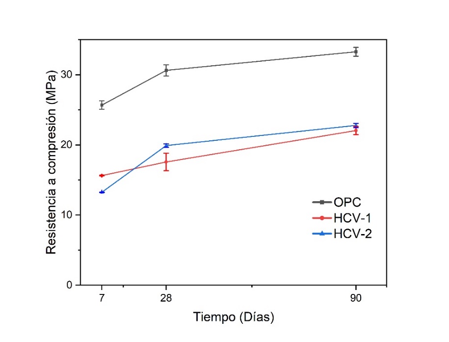 Definidas las proporciones óptimas de las pastas HCV, se realizó una comparación de la evolución de la resistencia a la compresión (1-90 días de curado) con los resultados correspondientes al de una pasta basada 100 % en OPC (Tipo UG).