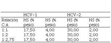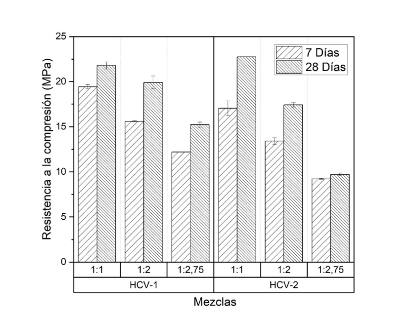 De los resultados reportados se seleccionaron dos sistemas HCV como óptimos, así a partir de los resultados de RC a 7 días se seleccionó la mezcla 52,50 % CV, 17,50 % HS, 30 % OPC y 4 % Na2SO4. (HCV-1), y con base en los resultados de 28 días se seleccionó la mezcla 40 % CV, 30 % HS, 30 % OPC y 2 % Na.SO. (HCV-2) (Figura 1). La dosificación de NS obtenida en estas mezclas concuerda con reportes previos que sugieren utilizar valores entre 1 % a 5 % en peso. [8], [37]-[39].
