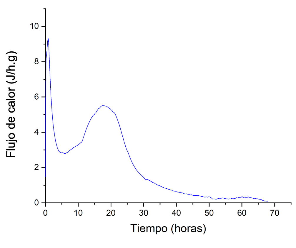 El tiempo inicial de fraguado de la pasta HCV-1, compuesta por 52,5 % de CV, 17,5 % de HS y 30 % de OPC, activado con NS al 4 % y una relación L/S de 0,45 fue de 108 minutos y el final de 360 minutos. En la Figura 4 se observa el flujo de calor de HCV-1, al determinar el área bajo la curva se obtuvo un calor total acumulado de 106 kJ/kg, el cual es menor al reportado por sistemas 100 % OPC que pueden presentar valores superiores a los 200 kJ/kg, esto concuerda con reportes en la literatura [6], [8]. Acorde a estos resultados el cemento híbrido activado HCV-1 puede ser clasificado como un cemento de moderado calor de hidratación (tipo MCH) según la NTC 121 [43], teniendo en cuenta el tiempo de fraguado inicial de 108 minutos y la RC promedio de 12,2 MPa a 7 días de curado en morteros con relación C:A de 1:2,75.