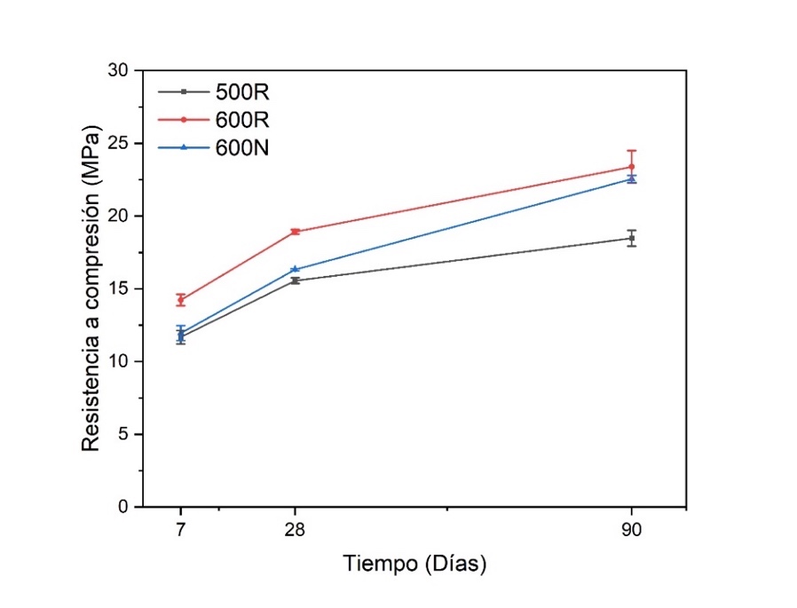 A partir de los sistemas óptimos se produjeron morteros, variando la relación en peso del sistema híbrido:arena en relación 1:1, 1:2 y 1:2,75 y empleado en todos los sistemas una relación constante (L/S de 0,45). Los morteros se elaboraron utilizando una mezcladora Hobart con un tiempo de mezclado de 4 minutos. Las muestras se moldearon en cubos de 50 mm de lado de acuerdo con los lineamientos definidos en la norma NTC 112 [22]. El proceso de curado de las muestras se realizó en una cámara húmeda a temperatura ambiente (25 ± 3 °C), para posteriormente determinar la resistencia a la compresión a las edades de 7 y 28 días por medio del ensayo en una prensa hidráulica Controls CT-1500 con capacidad de 1500 kN siguiendo el procedimiento de la norma NTC 220 [23]. Complementariamente se determinaron el tiempo de fraguado y el flujo de calor. El tiempo de fraguado se determinó según el método B descrito en la norma NTC 118 [24] (homóloga a ASTM C191), y la evolución de calor (durante la activación alcalina) y calor total de reacción (48 horas) fueron evaluados por medio de un calorímetro isotérmico I-Cal 8000 (ASTM C1702).
