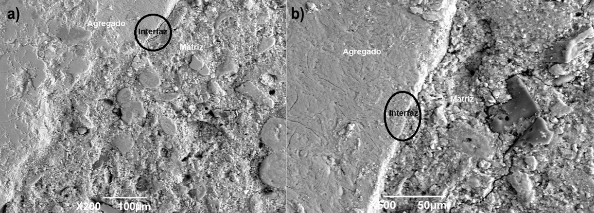 El análisis de la microestructura del concreto 600 R se llevó a cabo mediante microscopía electrónica de barrido (MEB), en la Figura 6a se aprecia una superficie densa, homogénea y con baja porosidad. En la zona de interfaz agregado-matriz se identifica que la matriz aporta una buena densificación y se observa una buena adhesión entre estas dos fases del concreto (Figura 6b), ratificando el buen comportamiento mecánico obtenido anteriormente.