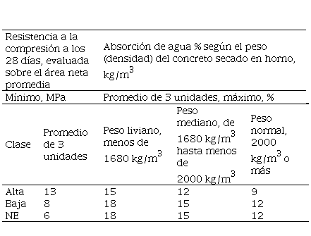 A partir del concreto CHCV-600R fueron producidos bloques perforados de concreto (Figura 7), con sustitución de AFR por corcho en un 10 % y 20 % en volumen (CHCV-F1 y CHCV-F2 respectivamente) y los resultados se compararon con el bloque sin corcho, es decir con 100 % AFR (CHCV-F0). La caracterización físico-mecánica se llevó a cabo de acuerdo con lo establecido en la norma NTC 4024, NTC 4026 y NTC 4076 [30], [15], [58]. En la Tabla 9 se muestran las especificaciones que deben de cumplir los bloques para ser clasificados como estructurales y no estructurales.