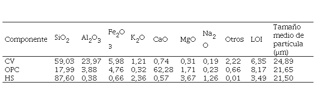 El tamaño medio de partícula D (4,3), determinado por la técnica de granulometría láser en un equipo Mastersizer 2000, fue de 24,89 μm, 21,50 μm y 21,65 μm, para CV, HS y OPC respectivamente. Cabe anotar que la determinación del tamaño de partícula del HS por esta técnica arroja un valor más elevado que el reportado en la ficha técnica del producto (0,1 μm), esto se debe a la aglomeración de las partículas durante el proceso de ensayo. Como activador alcalino se utilizó sulfato de sodio (Na2SO4) de uso industrial.