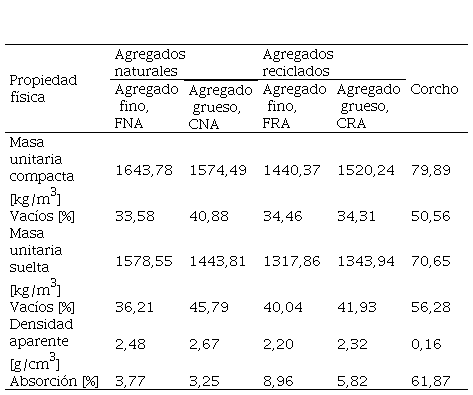 La Tabla 2 presenta las principales características de los agregados naturales y reciclados obtenidos a partir de una muestra de residuos de construcción y demolición (RCD). Los agregados reciclados presentaron altos niveles de absorción; 8,96 % (NTC 237 [17] homóloga a ASTM C128) para el agregado fino reciclado (AFR) y 5,82 % (NTC 176 [18] homóloga a ASTM C127) para el caso del agregado grueso reciclado (AGR). El tamaño máximo del AGR fue de 25,4 mm y el módulo de finura del AFR fue de 3,17 (arena gruesa) (NTC 77 [19] homóloga a ASTM C136). La resistencia al desgaste del AGR fue del 28,2 %, siendo posible su uso en la producción de mezclas de concreto teniendo en cuenta este valor y los estipulado por la NTC 98 [20] (homóloga a ASTM C131). El contenido de materia orgánica (NTC 127 [21] homóloga a ASTM C40) del AFR fue el mínimo (organic plate No. 1), permitiendo su uso en mezclas de morteros y/o concretos.