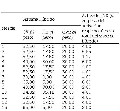En los sistemas HCV se evaluó el efecto en la resistencia a la compresión (7 y 28 días de curado) del contenido de activador NS en el rango de 2-6 %, y el porcentaje de remplazo de HS con respecto a la ceniza volante (0-35 % de la mezcla total). El ensayo de resistencia se realizó en una máquina universal INSTRON 3369 con capacidad de 50 kN y una velocidad de 1 mm/min. Para obtener las proporciones óptimas de NS y HS, en los rangos anteriormente definidos, se empleó el software Minitab 17 y un diseño experimental de superficie de respuesta que arrojo un total de 13 mezclas, tal como se muestra en la Tabla 3. La relación liquido/solido (L/S) en todas las mezclas fue de 0,4. Para la preparación de las pastas, se utilizó una mezcladora Hobart, y el tiempo de mezclado fue de 4 minutos. Las pastas se moldearon en cubos de 20 mm de lado y se sometieron a vibración durante 30 segundos con el objeto de remover el aire naturalmente atrapado durante el mezclado y moldeo, seguido se introdujeron en una cámara húmeda a temperatura ambiente (25 ± 3 °C) en donde se realizó su proceso de curado. Para cada sistema por edad de curado se evaluaron un mínimo de 3 muestras.